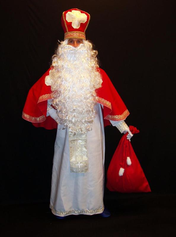 ## Костюм-комплект Святого Николая - УЖГОРОДСКИЙ-6 р-р 46-54 Код 230306 Костюм-комплект Святого Николая - УЖГОРОДСКИЙ-6 отшивается в одном универсальном размере – 46-54 на рост 170-190 см В данный комплект костюма Святого Николая ВХОДЯТ: 1. Риза - длинное (почти в пол) праздничное-торжественное облачение Святого Николая из белоснежно-белого, слегка блестящего, полусинтетического (с хлопком) эффектного материала саржево-габардинного типа (производство Италия), отороченное широкой (5 см) ажурной бело-золотистой тесьмой по подолу и манжетам-рукавам (10 см). 2. Верхняя христианская мантия Святого Николая из НАСЫЩЕННОГО ЯРКО-КРАСНОГО ЦВЕТА оттенка «АЛЫЙ», слегка блестящего, полусинтетического (с хлопком) эффектного материала саржево-габардинного типа (производство Италия). Мантия Николая оторочена широкой (5 см) ажурной бело-золотистой тесьмой по всему периметру и в зоне воротника. Мантия богато украшена вышитыми ЗОЛОТОМ христианскими крестами (аппликации) по БЛАГОРОДНОМУ МОЛОЧНО-БЕЛОМУ ФОНУ и изобразительными элементами традиционной христианской символики. Мантия имеет скрытую пуговичную застежку сзади, на затылке. 3. Одним из главных и основополагающих элементов для создания полноценного образа Святого Николая является, входящая в комплект, шапка-митра Святого Николая. Митра сложного кроя и изготовлена по всем канонам православной и католической церквей. Жесткость конструкции и возможность сохранять форму достигнута в митре Святого Николая благодаря инновационной технологии пошива. Изделие имеет трёхслойную структуру. Внутренний слой, прилегающий к голове при надевании шапки – шёлковая подкладка белого цвета. Средний слой - основа головного убора Святого Николая - выполнена из современного плотного и при этом тонкого корсажно-войлочного материала, обеспечивающего упругость граней шапки, что в свою очередь, позволяет не только сохранять и поддерживать изначальную форму митры, а также возможность складывания изделия по граням (при транспортировке или хранении, например) с сохранением уникальной возможности вернуть исходную форму митры при распаковке. Верхний слой митры изготовлен из качественной смесевой полусинтетической, прочной и плотной ткани, не дающей усадки и не нуждающейся в декатировке (типа саржи-габардина) НАСЫЩЕННОГО ЯРКО-КРАСНОГО ЦВЕТА оттенка «АЛЫЙ». Головной убор Святого Николая украшен широкой ажурной бело-золотистой тесьмой по нижнему краю головного убора, а также рельефной тесьмой-«косичкой» ЗОЛОТИСТОГО цвета по ребрам митры. Центральная часть митры украшена с лицевой стороны чрезвычайно эффектным крупным христианским крестом ЗОЛОТОГО ЦВЕТА, расшитым ЗОЛОТЫМИ металлизированными нитями (исполнен как пришивная аппликация). 4. Белые трикотажные (шитые) перчатки стретчевого типа (100% хлопок). Код товара 13006. 5. Большая реалистичная борода с двойной резинкой «ВОЛЬНАЯ»(75 см, 190 гр.) Код 02709 6. Популярный качественный длинный мужской реалистичный парик «БЕЛЫЙ СНЕГ». Длинна -60-65 см. Вес – 140-150 грамм. Код товара 01704. 7. Прочный и вместительный мешок для подарков из синей основной ткани «ДЕКАБРЬСКИЙ» с завязками, украшенными меховыми помпонами (48х75 см). Код товара 12033. В данный комплект костюма Святого Николая НЕ ВХОДЯТ (можно приобрести на нашем сайте дополнительно): - Посох Святого Николая (можно выбрать по размеру, длине, т