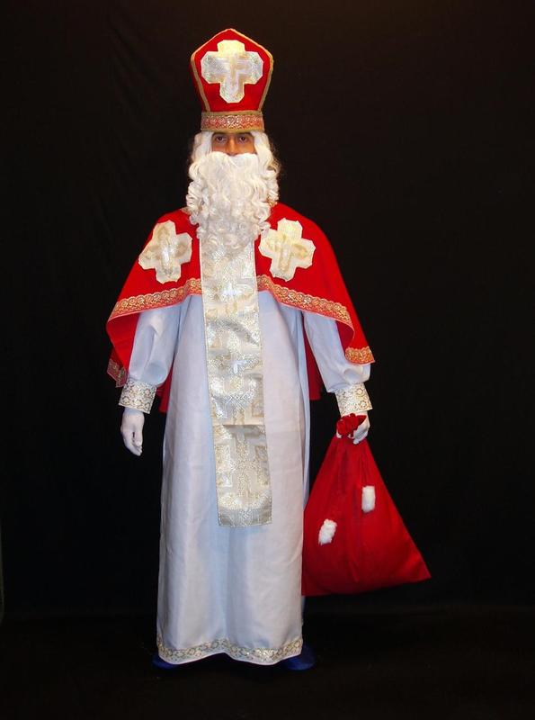## Костюм-комплект Святого Николая - УЖГОРОДСКИЙ-4 р-р 46-54 Код 230304 Костюм-комплект Святого Николая - УЖГОРОДСКИЙ-4 отшивается в одном универсальном размере – 46-54 на рост 170-190 см В данный комплект костюма Святого Николая ВХОДЯТ: 1. Риза - длинное (почти в пол) праздничное-торжественное облачение Святого Николая из белоснежно-белого, слегка блестящего, полусинтетического (с хлопком) эффектного материала саржево-габардинного типа (производство Италия), отороченное широкой (5 см) ажурной бело-золотистой тесьмой по подолу и манжетам-рукавам (10 см). 2. Верхняя христианская мантия Святого Николая из НАСЫЩЕННОГО ЯРКО-КРАСНОГО ЦВЕТА оттенка «АЛЫЙ», слегка блестящего, полусинтетического (с хлопком) эффектного материала саржево-габардинного типа (производство Италия). Мантия Николая оторочена широкой (5 см) ажурной бело-золотистой тесьмой по всему периметру и в зоне воротника. Мантия богато украшена вышитыми ЗОЛОТОМ христианскими крестами (аппликации) по БЛАГОРОДНОМУ МОЛОЧНО-БЕЛОМУ ФОНУ и изобразительными элементами традиционной христианской символики. Мантия имеет скрытую пуговичную застежку сзади, на затылке. 3. Одним из главных и основополагающих элементов для создания полноценного образа Святого Николая является, входящая в комплект, шапка-митра Святого Николая. Митра сложного кроя и изготовлена по всем канонам православной и католической церквей. Жесткость конструкции и возможность сохранять форму достигнута в митре Святого Николая благодаря инновационной технологии пошива. Изделие имеет трёхслойную структуру. Внутренний слой, прилегающий к голове при надевании шапки – шёлковая подкладка белого цвета. Средний слой - основа головного убора Святого Николая - выполнена из современного плотного и при этом тонкого корсажно-войлочного материала, обеспечивающего упругость граней шапки, что в свою очередь, позволяет не только сохранять и поддерживать изначальную форму митры, а также возможность складывания изделия по граням (при транспортировке или хранении, например) с сохранением уникальной возможности вернуть исходную форму митры при распаковке. Верхний слой митры изготовлен из качественной смесевой полусинтетической, прочной и плотной ткани, не дающей усадки и не нуждающейся в декатировке (типа саржи-габардина) НАСЫЩЕННОГО ЯРКО-КРАСНОГО ЦВЕТА оттенка «АЛЫЙ». Головной убор Святого Николая украшен широкой ажурной бело-золотистой тесьмой по нижнему краю головного убора, а также рельефной тесьмой-«косичкой» ЗОЛОТИСТОГО цвета по ребрам митры. Центральная часть митры украшена с лицевой стороны чрезвычайно эффектным крупным христианским крестом ЗОЛОТОГО ЦВЕТА, расшитым ЗОЛОТЫМИ металлизированными нитями (исполнен как пришивная аппликация). 4. Белые трикотажные (шитые) перчатки стретчевого типа (100% хлопок). Код товара 13006. 5. Реалистичный природного естественного цвета человеческого седого волоса комплект (парик + борода) «РЕАЛ-КОМПЛЕКТ». (вес парика – 130 гр., вес бороды – 80 гр). Код товара 03729- 6. Прочный и вместительный мешок для подарков из синей основной ткани «ДЕКАБРЬСКИЙ» с завязками, украшенными меховыми помпонами (48х75 см). Код товара 12033. В данный комплект костюма Святого Николая НЕ ВХОДЯТ (можно приобрести на нашем сайте дополнительно): - Посох Святого Николая (можно выбрать по размеру, длине, типу верхушки, цвету и материа