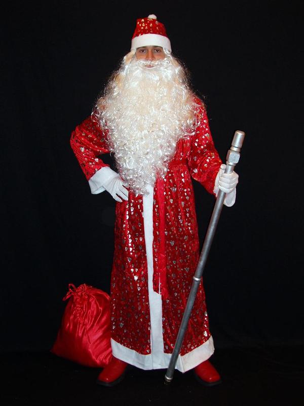 Костюм Св.Николая/Д.Мороза СНЕЖНЫЕ БЛЕСТКИ-6 р-р 48-52 Код 107826 Костюм в одном размере. Подходит на 48-52 размеры и на рост 170-185 см Комплект-костюм Деда Мороза «СНЕЖНЫЕ БЛЁСТКИ-6» один из самых эффектны и потому - популярных комплект-костюмов в ярко-красно-алой цветовой гамме! Ежегодно таких костюмов у нас покупают более 100 комплектов! В комплект костюма входит: 1. Шуба Деда Мороза с эффектными блестками в форме звёздочек и ёлочек 2. Пояс из основной велюровой ткани, украшенный зеркальными блёстками (принт) 3. Шапка-колпак, украшенная зеркальными блёстками (принт) с бубоном 4. Большая солидная реалистичная борода Деда Мороза «РЕАЛЬНАЯ» (60 см, 140 гр.) Код 02707 5. Великолепный длинный парик «Белый снег» под стать бороде. Код 01704. Длина 55-65 см, вес 145-150 грамм) 6. Большой мешок для подарков из красного атласа с завязками. Код 12017. Размер 50х75 см 7. Перчатки белые (случайный выбор) В комплект костюма Деда Мороза «СНЕЖНЫЕ БЛЁСТКИ-6» НЕ ВХОДЯТ (можно приобрести на нашем сайте дополнительно): - Посох Деда Мороза (можно выбрать любой по размеру, длине, типу верхушки, цвету и материалу изготовления, конструкции (сборный или цельный) и цене посох Деда Мороза с учётом вашего вкуса и потребностей). - Сапоги или валенки Деда Мороза (можно купить дополнительно на нашем сайте) различные по технологии изготовления, материалу, высоте голенища, цене. - Брюки Деда Мороза (можно купить дополнительно на нашем сайте). Есть все размеры брюк, на любой рост. Цвета – красный, синий, бордовый. - Микрофон портативный с усилителем и динамиком и модератором-изменителем голоса.