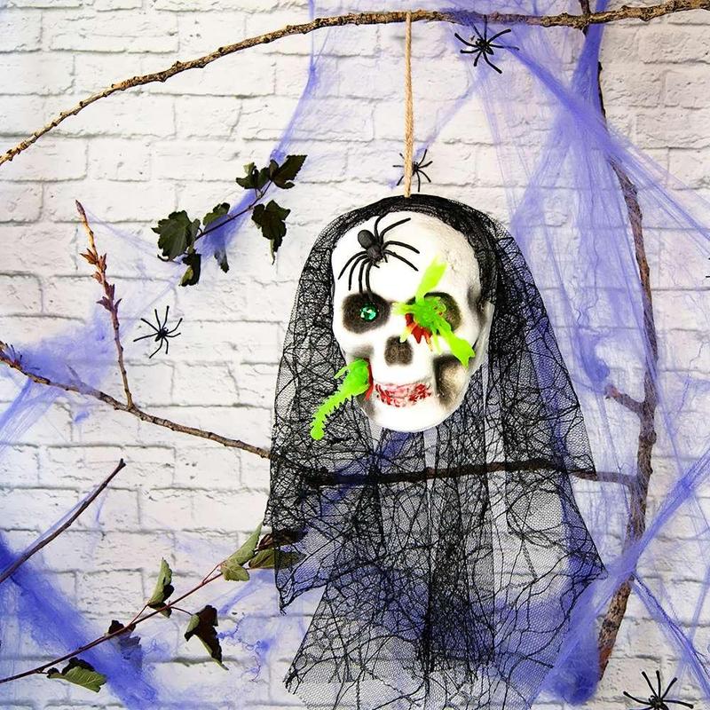 Череп готический Астарта черный №10027 HL1-0027 Размеры: 40х15х13см Цвет: черный Материал: гипюр, пенополистирол Череп готический Астарта черный №10027 - украшение на Хэллоуин из серии подвесного декора с петелькой для подвешивания на вечеринку в стиле Santa Muerte или Хэллоуин. Череп готический с фатой изготовлен из качественного материала, который не рассыпается, пенополистирола, фата - гипюр. Особого шарма готическому черепу придает проходящий светоотражающий скорпион сквозь череп через скулу и глазницу. А зеленый кристалл в глазе эффектно переливается и создает впечатление горящего глазп при попадании света. Идеально подходит для украшения арт-пространства клуба, фото зоны на Хэллоуин. Просто повесьте на дверь или стену, чтобы удивить ваших гостей во время праздника Дня всех мертвых. Также декор можно поставить на край стола, барной стойки и фата будет красиво свисать. Рекомендуем к этому подвесному черепу готическому еще паутину и череп светильник, которые помогут Вам воссоздать мистическую атмосферу.