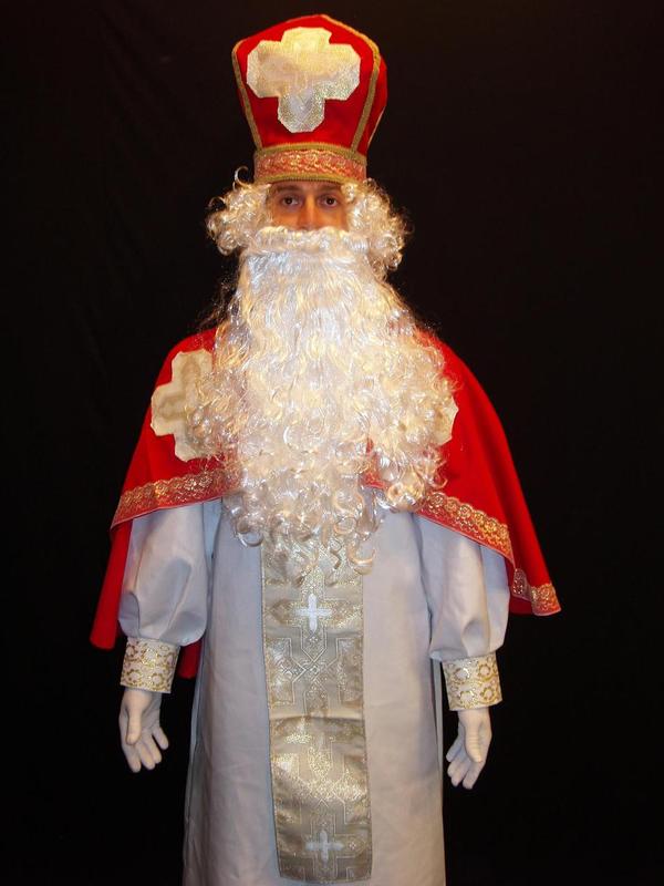 ## Костюм-комплект Святого Миколая - УЖГОРОДСЬКИЙ-3 р-р 46-54 Код 230303 Костюм-комплект Святого Миколая - УЖГОРОДСЬКИЙ-3 відшивається в одному універсальному розмірі – 46-54 на зріст 170-190 см. В даний комплект костюма Святого Миколая ВХОДЯТЬ: 1. Різа - довге (майже в підлогу) святкове-урочисте вбрання Святого Миколая з білосніжно-білого, злегка блискучого, напівсинтетичного (з бавовною) ефектного матеріалу саржево-габардинного типу (виробництво Італія), облямоване широкою (5 см) ажурною біло-золотою. подолу та манжетам-рукавам (10 см). 2. Верхня християнська мантія Святого Миколая з НАСИЧЕНОГО ЯСКРАВО-ЧЕРВОНОГО КОЛЬОРУ відтінку «АЛИЙ», злегка блискучого, напівсинтетичного (з бавовною) ефектного матеріалу саржево-габардинного типу (виробництво Італія). Мантія Миколи оторочена широкою (5 см) ажурною біло-золотистою тасьмою по всьому периметру та в зоні коміра. Мантія багато прикрашена вишитими ЗОЛОТОМ християнськими хрестами (аплікації) за БЛАГОРОДНИМ МОЛОЧНО-БІЛОМУ ФОНУ та образотворчими елементами традиційної християнської символіки. Мантія має приховану гудзикову застібку ззаду, на потилиці. 3. Одним з головних і основоположних елементів для створення повноцінного образу Святого Миколая є шапка-мітра Святого Миколая, що входить до комплекту. Мітра складного крою та виготовлена за всіма канонами православної та католицької церков. Жорсткість конструкції та можливість зберігати форму досягнута у митрі Святого Миколая завдяки інноваційній технології пошиття. Виріб має тришарову структуру. Внутрішній шар, що прилягає до голови при надяганні шапки – шовкова підкладка білого кольору. Середній шар - основа головного убору Святого Миколая - виконана з сучасного щільного і при цьому тонкого корсажно-повстяного матеріалу, що забезпечує гнучкість граней шапки, що в свою чергу дозволяє не тільки зберігати і підтримувати початкову форму мітри, а також можливість складання виробу по граням. при транспортуванні або зберіганні, наприклад) із збереженням унікальної можливості повернути вихідну форму мітри під час розпакування. Верхній шар мітри виготовлений з якісної сумішевої напівсинтетичної, міцної і щільної тканини, що не дає усадки і не потребує декатирування (типу саржі-габардину) НАСИЧЕНОГО ЯСКРАВО-ЧЕРВОНОГО КОЛЬОРУ відтінку «Червоний» . Головний убір Святого Миколая прикрашений широкою ажурною біло-золотистою тасьмою по нижньому краю головного убору, а також рельєфною тасьмою-«кіскою» ЗОЛОТИСТОГО кольору по ребрах мітри. Центральна частина мітри прикрашена з лицьового боку надзвичайно ефектним великим християнським хрестом ЗОЛОТОГО КОЛЬОРУ, розшитим ЗОЛОТИМИ металізованими нитками (виконаний як пришивна аплікація). 4. Білі трикотажні (шиті) рукавички стретчевого типу (100% бавовна). Код товару 13006 . 5. Реалістична велика борода «ЗНАТНА» (55 см, 125 гр.) Код 02716 6. Популярна якісна довга чоловіча реалістична перука «БІЛИЙ СНІГ». Довжина -60-65 см. Вага - 140-150 грам. Код товару 01704. У цей комплект костюма Святого Миколая НЕ ВХОДЯТЬ (можна придбати на нашому сайті додатково): - Мішок для подарунків Святого Миколая (можна вибрати будь-який за розміром, тканиною, кольором та кольоровими відтінками, з декором і без, із зав'язками простими або зі шнуром або хутряними облямівками). - Посох Святого Миколая (можна вибрати за розміром, довжиною, типом верхів