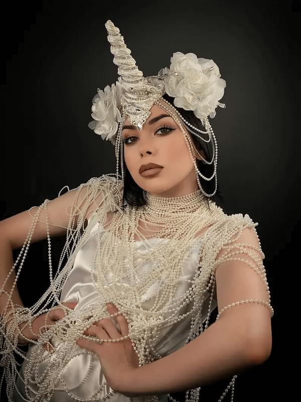 Обруч Единорог New 23-539WT Фантастический головной убор в белом цвете состоит из тканевых цветов, стеклянных страз, цепочек и, конечно же, жидкого пластикового рога единорога. Прекрасное дополнение к праздничному наряду в стиле фэнтези. Эта милая и необычная повязка на голову идеально подойдет для праздника, вечеринки, девичника, дня рождения, Хэллоуина, фотосессии или просто на каждый день. Размер этого головного убора унив23-539GLерсальный для взрослого человека. На голове сидит мягко и удобно, можно долго танцевать и двигаться. Высота композиции – до 16 см.