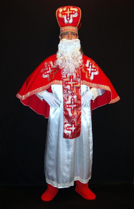 ## Костюм-комплект Святого Миколая СІМФЕРОПОЛЬСЬКИЙ-1 р-р 48-54. Код 230341 Костюм-комплект Святого Миколая СІМФЕРОПОЛЬСЬКИЙ-1 відшивається в одному універсальному розмірі – 48-54 на зріст 175-190 см У комплект костюма Святого Миколая «СІМФЕРОПОЛЬСЬКИЙ-1» входять: 1. Нижнє довге вбрання Святого Миколая з білого блискучого атласу або напівсинтетичної саржі-габардину, облямована широкою біло-золотистою тасьмою по подолу та рукавам. 2. Верхнє парадно-святкове вбрання Святого Миколая з напівсинтетичної саржі-габардину ЯСКРАВО-ЧЕРВОНОГО кольору, облямоване широкою біло-золотистою тасьмою по краю і коміру і багато прикрашене вишитими хрестами (аплікації) і доповнене ошатною ризикою символом червоного кольору. 3. Шапка-мітра Святого Миколая на щільній корсажно-повстяній підкладці, верх - з напівсинтетичної саржі-габардину ЯСКРАВО-ЧЕРВОНОГО кольору. Мітра прикрашена широкою біло-золотистою тасьмою по нижньому краю, тасьмою-кіскою золотистого кольору по ребрах мітри, а також доповнена хрестом (аплікація), вишитим срібними нитками. 4. Білі нейлонові (шиті) рукавички стретчевого типу. Код товару 12005. У комплект костюма Святого Миколая «СІМФЕРОПОЛЬСЬКИЙ-1» НЕ ВХОДЯТЬ (можна придбати на нашому сайті додатково): - Плащаниця-мантія Святого Миколая , що представляє собою «плащ-накидку» прозоро-білого кольору, виконану з легкої шовкової тканини і облямована широкою (5 см. шириною) ажурною мереживною тасьмою, вишитою християнським канонічним орнаментом на гіпюровій основі. (можна глянути на цей аксесуар, подивитися кілька фото і дізнатися про нього більше, якщо введете у пошуковий рядок на сайті код товару: 230000 - Борода Святого Миколая (можна вибрати за розміром, довжиною, пишнотою, якістю волосся і ціною бороду Святого Миколая з урахуванням власного смаку та потреб). - Перука Святого Миколая (можна вибрати за розміром, довжиною, пишнотою, якістю волосся та ціною перуку Святого Миколая з урахуванням вашого смаку та потреб). - Мішок для подарунків Святого Миколая (можна вибрати будь-який за розміром, тканиною, кольором та кольоровими відтінками, з декором і без, із зав'язками простими або зі шнуром або хутряними облямівками). - Посох Святого Миколая (можна вибрати за розміром, довжиною, типом верхівки, кольором і матеріалом виготовлення, конструкцією (збірний або цільний) і ціною посох Святого Миколая з урахуванням вашого смаку та потреб). - Чоботи або валянки Святого Миколая (можна купити додатково на нашому сайті різне взуття за технологією виготовлення, матеріалом, висотою халяви, ціною) - Штани Святого Миколая (можна вибрати за розміром, тканиною, кольором). - Мікрофон портативний з підсилювачем та динаміком