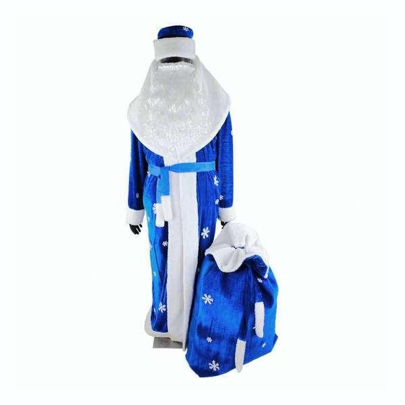 Костюм Святий Миколай 19-1013-1 У костюм входить шапка, борода, халат, мішок для подарунків. Халат з поясом, прикрашений білими сніжинками, підійде для образу Святий Миколай (Морозко, Діда Мороза). Довжина - 150 см. Напівобхват грудей - 67 см. Розмір - 48-52. Усі елементи костюма можна придбати окремо.