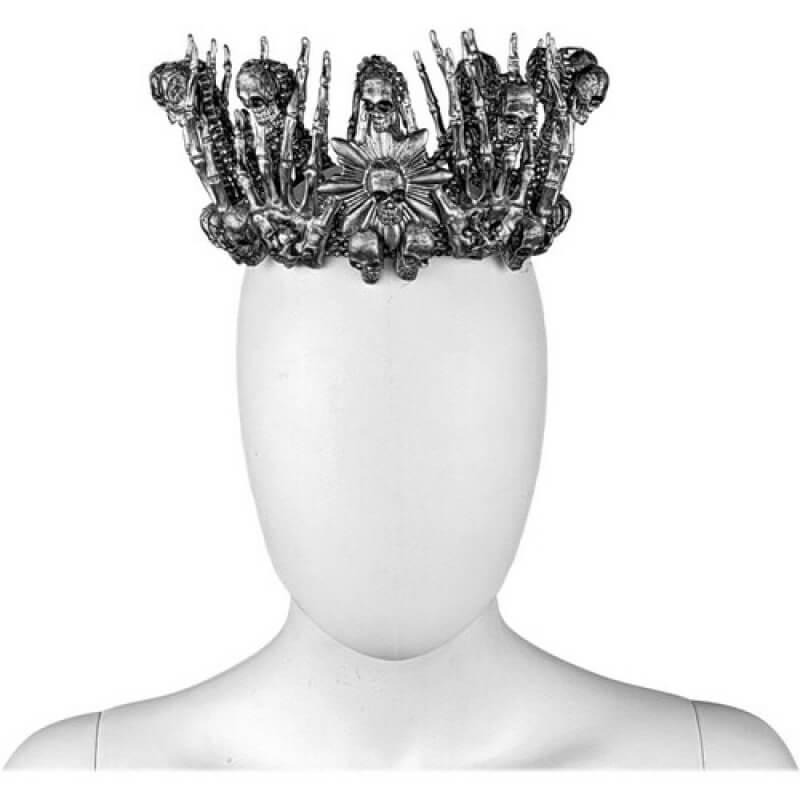 КОРОНА КОРОЛЕВА БЕРТА 22-321SL Колекція: Головні убори Матеріал: пластик Колір: сріблястий Висота композиції – 10 см. Оригінальна корона, декорована маленькими золотистими черепами та штучними кистями скелета. Підійде для доповнення карнавального образу на Хелловін: мертвий ліс, темний ліс, королева темряви, готична королева, відьма (відьмочка). Розмір універсальний, кріпиться за допомогою гумки.