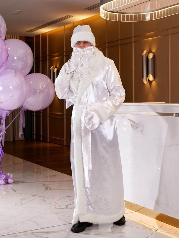Костюм Св.Миколая/Діда Мороза атласний білий р-р 44-54 . Код 08557/RZ-3011A950 Тканина: атлас У комплекті: халат, шапка, борода, рукавички, мішок, Пояс із атласної тканини Довжина 150 см Об'єм до 150 см Розмір: 44 - 54