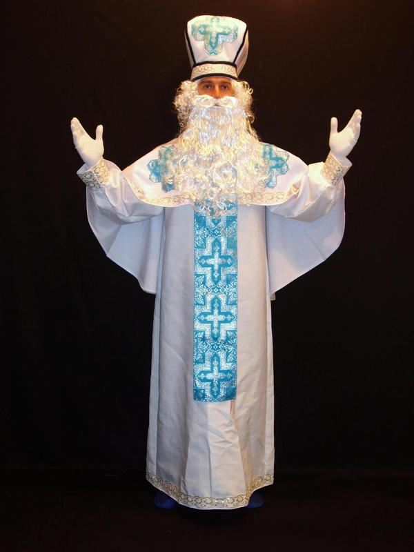 ## Костюм-комплект Святого Николая - МУКАЧЕВСКИЙ-2 р-р 46-54 Код 230262 Костюм-комплект Святого Николая - МУКАЧЕВСКИЙ-2 отшивается в одном универсальном размере – 46-54 на рост 170-190 см. В данный комплект костюма Святого Николая ВХОДЯТ: 1. Риза - длинное (почти в пол) праздничное-торжественное облачение Святого Николая из белоснежно-белого, слегка блестящего, полусинтетического (с хлопком) эффектного материала саржево-габардинного типа (производство Италия), отороченное широкой (5 см) ажурной бело-золотистой тесьмой по подолу и манжетам-рукавам (10 см). 2. Верхняя христианская мантия Святого Николая из БЕЛОСНЕЖНО-БЕЛОГО, слегка блестящего, полусинтетического (с хлопком) эффектного материала саржево-габардинного типа (производство Италия). Мантия Николая оторочена широкой (5 см) ажурной бело-золотистой тесьмой по всему периметру и в зоне воротника. Мантия богато украшена вышитыми христианскими крестами (аппликации) и элементами традиционной христианской символики. Мантия имеет скрытую пуговичную застежку сзади, на затылке. 3. Одним из главных и основополагающих элементов для создания полноценного образа Святого Николая является, входящая в комплект, шапка-митра Святого Николая. Митра сложного кроя и изготовлена по всем канонам православной и католической церквей. Жесткость конструкции и возможность сохранять форму достигнута в митре Святого Николая благодаря инновационной технологии пошива. Изделие имеет трёхслойную структуру. Внутренний слой, прилегающий к голове при надевании шапки – шёлковая подкладка белого цвета. Средний слой - основа головного убора Святого Николая - выполнена из современного плотного и при этом тонкого корсажно-войлочного материала, обеспечивающего упругость граней шапки, что в свою очередь, позволяет не только сохранять и поддерживать изначальную форму митры, а также возможность складывания изделия по граням (при транспортировке или хранении, например) с сохранением уникальной возможности вернуть исходную форму митры при распаковке. Верхний слой митры изготовлен из качественной смесевой полусинтетической, прочной и плотной ткани, не дающей усадки и не нуждающейся в декатировке (типа саржи-габардина) БЕЛОСНЕЖНО- БЕЛОГО цвета. Головной убор Святого Николая украшен широкой ажурной бело-золотистой тесьмой по нижнему краю головного убора, а также рельефной тесьмой-«косичкой» ТЁМНО-СИНЕГО цвета по ребрам митры. Центральная часть митры украшена с лицевой стороны чрезвычайно эффектным крупным христианским крестом БИРЮЗОВОГО ЦВЕТА, расшитым СЕРЕБРЯНЫМИ металлизированными нитями (исполнен как пришивная аппликация). 4. Белые трикотажные (шитые) перчатки стретчевого типа (100% хлопок). Код товара 13006. 5. Реалистичная борода «ВЛАСТНАЯ» (40-45 см, 65-75 гр.). Код товара 02719 6. Реалистичный вьющийся парик «ДЕКАБРЬСКИЙ». Вес – 120 грамм. Код товара 01702 В данный комплект костюма Святого Николая НЕ ВХОДЯТ (можно приобрести на нашем сайте дополнительно): - Мешок для подарков Святого Николая (можно выбрать любой по размеру, ткани, цвету и цветовым оттенкам, с декором и без, с завязками простыми или со шнуром или меховыми опушками). - Посох Святого Николая (можно выбрать по размеру, длине, типу верхушки, цвету и материалу изготовления, конструкции (сборный или цельный) и цене посох Святого Николая с учётом вашего вкуса и потребностей). 