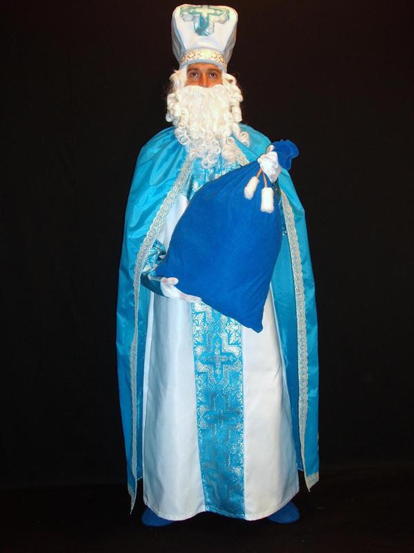## Костюм-комплект Святого Миколая - БРОВАРСЬКИЙ-3 р-р 46-54. Код 230443 Костюм-комплект Святого Миколая - БРОВАРСЬКИЙ-3 відшивається в одному універсальному розмірі – 46-54 на зріст 170-195 см. До складу комплекту костюма входять такі аксесуари: 1. Різа - довге (майже в підлогу) святкове-урочисте вбрання Святого Миколая з білосніжно-білого, злегка блискучого, напівсинтетичного (з бавовною) ефектного матеріалу саржево-габардинного типу (виробництво Італія). Комірець стійка. Рукави складного крою, з пишними "ліхтариками" - комбіновані з високими, регульованими "липучками", манжетами. Різа багато прикрашена вишитими сріблястими металізованими нитками по бірюзовому габардину християнськими хрестами (аплікації) та іншими елементами традиційної християнської символіки. Різа має приховану гудзикову застібку ззаду, на потилиці. 2. Довга плащаниця-мантія Святого Миколая бірюзового кольору , виконана з легкої «летючої» плащівки та декорована по периметру мереживною ажурною широкою (5 см) тасьмою з християнською символікою, виконаною ажурною машинною вишивкою в стилізації канонічного орнам. Вишивка виконана золотими нитками. Мантія надягає поверх ризи і дуже ефектна. При русі вона «майорить» від руху вітру, зраджуючи відчуття динаміки. 3. Унікальна шапка-мітра Святого Миколая - один із головних та основоположних елементів для створення повноцінного образу Святого Миколая, Митра складного крою та виготовлена за всіма канонами православної та католицької церков. Жорсткість конструкції та можливість зберігати форму досягнута у митрі Святого Миколая завдяки інноваційній технології пошиття. Виріб має тришарову структуру. Внутрішній шар, що прилягає до голови при надяганні шапки – шовкова підкладка білого кольору. Середній шар - основа головного убору Святого Миколая - виконана з сучасного щільного і при цьому тонкого корсажно-повстяного матеріалу, що забезпечує гнучкість граней шапки, що в свою чергу дозволяє не тільки зберігати і підтримувати початкову форму мітри, а також можливість складання виробу по граням. при транспортуванні або зберіганні, наприклад) із збереженням унікальної можливості повернути вихідну форму мітри під час розпакування. Верхній шар мітри виготовлений з якісної сумішевої напівсинтетичної, міцної і щільної тканини, що не дає усадки і не потребує декатирування (типу саржі-габардину) БІЛОСНІЖНО-БІЛОГО кольору. Головний убір Святого Миколая прикрашений широкою мереживною ажурною біло-золотистою тасьмою по нижньому краю головного убору, а також рельєфною тасьмою-«кіскою» ГЛИБОКОГО ТЕМНО-СИНЬОГО кольору по ребрах мітри. Центральна частина мітри прикрашена з лицьового боку надзвичайно ефектним великим християнським хрестом БІРЮЗОВОГО КОЛЬОРУ, розшитим СРІБНИМИ металізованими нитками (виконаний як пришивна аплікація). 4. Білі нейлонові (шиті) рукавички стретчевого типу. Код товару 12005. 5. Реалістичний природного кольору людського сивого волосся комплект (перука + борода) «РЕАЛ-КОМПЛЕКТ» . (Вага перуки - 130 гр., Вага бороди - 80 гр.). Код товару 03729 6. Місткий мішок для подарунків (68 х 50 см.) «ФЛІРТОВИЙ» . Колір-синій електрик, відшитий із щільного велюру з ПОМПОНАМИ на зав'язках, зав'язки – бронзова тасьма. Код товару 12134 До складу цього комплекту костюма НЕ ВХОДЯТЬ (можна придбати на нашому сайті додатково): - Посох Святого Микол