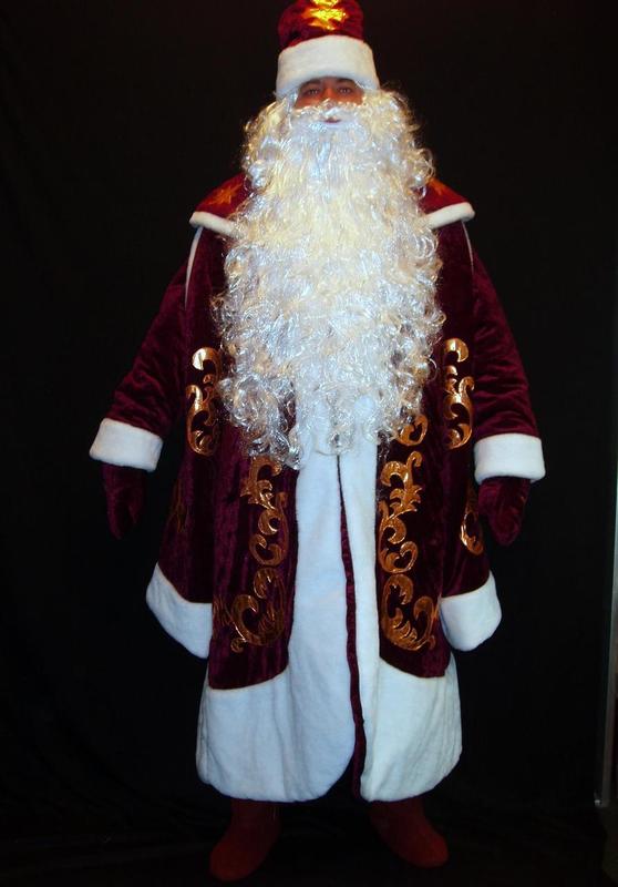 ## Костюм-комплект Св.Миколая/Діда Мороза - ГАЛИЦЬКИЙ БОРДО-2 р-р 50-58 Код 230452 Костюм-комплект Св.Миколая/Діда Мороза - ГАЛИЦЬКИЙ БОРДО-2 відшивається в одному універсальному розмірі – 50-58 на зріст 170-195 см. В даний комплект костюма Св.Миколая/Діда Мороза ВХОДЯТЬ: 1. Шуба на підкладці з бордового щільного оксамиту, із золотими блискучими аплікаціями на полицях шуби, подвійних рукавах та спині. Шуба має шалевий комір-пелерину, оторочена білим хутром типу «мутон» на комірі, подвійних рукавах, подолу, полицях 2. Шапка на синтепоновій підкладці , з бордового щільного оксамиту, облямована хутром, із золотими аплікаціями 3. Рукавиці на синтепоновій підкладці , з бордового щільного оксамиту, облямовані білим хутром 4. Мішок із бордового щільного оксамиту (50х70 см), на підкладці, прикрашений ефектними золотими аплікаціями. 5. Велика реалістична борода з подвійною гумкою «ВІЛЬНА» (75 см, 190 гр.) Код 02709. 6. Популярна якісна довга чоловіча реалістична перука «БІЛИЙ СНІГ» . Довжина -60-65 см. Вага - 140-150 грам. Код товару 01704. До складу цього комплекту костюма НЕ ВХОДЯТЬ (можна придбати на нашому сайті додатково): - Плащаниця-мантія Святого Миколая , що представляє собою «плащ-накидку» прозоро-білого кольору, виконану з легкої шовкової тканини і облямована широкою (5 см. шириною) ажурною мереживною тасьмою, вишитою християнським канонічним орнаментом на гіпюровій основі. (можна глянути на цей аксесуар, подивитися кілька фото і дізнатися про нього більше, якщо введете у пошуковий рядок на сайті код товару: 230000 - Посох (можна вибрати за розміром, довжиною, типом верхівки, кольором і матеріалом виготовлення, конструкцією (збірний або цільний) і ціною посох з урахуванням вашого смаку та потреб). - Чоботи або валянки (можна купити додатково на нашому сайті різне взуття за технологією виготовлення, матеріалом, висотою халяви, ціною) - Штани (можна вибрати за розміром, тканиною, кольором). - Мікрофон портативний з підсилювачем та динаміком