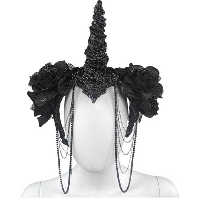 Обруч Єдиноріг New 23-539BLK Фантастичний головний убір у чорному кольорі складається з тканинних квітів, скляних страз, ланцюжків і, звичайно ж, рідкого пластикового рогу єдинорога. Прекрасне доповнення до святкового вбрання у стилі фентезі. Ця мила та незвичайна пов'язка на голову ідеально підійде для свята, вечірки, дівич-вечора, дня народження, Хеллоуїна, фотосесії або просто на кожен день. Розмір цього головного убору універсальний для дорослої людини. На голові сидить м'яко та зручно, можна довго танцювати та рухатися. Висота композиції – до 16 см.