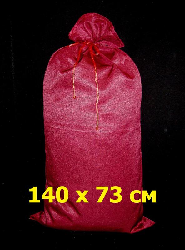 Мішок Св.Миколая/Діда Мороза/Санти (73х140см) ГІГАНТ БОРДОВИЙ з кольоровим шнуром . Код 12106 Мішок «ГІГАНТ» — це дійсно великий і ефектний варіант для новорічних подарунків. Виконаний у глибокому бордово-вишневому відтінку, що нагадує колір стиглої вишні, розміром 140 х 73 см. Його яскраві, товсті зав’язки в різнокольоровому плетенні не лише додають святкового вигляду, а й забезпечують надійне та зручне закривання. Матеріали та якість виготовлення Мішок пошитий із надміцної напівсинтетичної тканини, яка відзначається щільністю, стійкістю до зносу та зберігає форму навіть після численних прань. Тканина практична у використанні: легко очищується, майже не мнеться й завжди має охайний вигляд. Кольорові шнури завдовжки до 90 см дозволяють красиво зав’язати мішок, залишивши ефектні вільні кінці, які гармонійно доповнюють його зовнішній вигляд. Шнури не линяють і не зменшуються після прання. Усі шви прошиті армованими нитками, що гарантує додаткову міцність – мішок витримує вагомі навантаження без ризику розриву у найвідповідальніший момент. Основні характеристики •Висота: 140 см •Ширина: 73 см •Колір: Бордово-вишневий (відтінок «переспіла вишня») Для кого підходить цей мішок Такий формат ідеально підходить для масштабних подій — свят у дитсадках, школах, на підприємствах, новорічних ранках чи корпоративних заходах. Також стане у пригоді для пакування великих або численних подарунків. Коли варто обрати саме цей мішок? •Ви втратили попередній мішок і хочете швидко доукомплектувати костюм. •Ваш старий мішок виглядає зношеним і втратив привабливість. •Існуючий мішок незручний у використанні – зав’язки короткі, тканина слабка або просто дратує. •Поточний мішок замалий, і не вміщує все заплановане. •Хочеться просто оновити образ або доповнити костюм, який продавався без мішка. На що звернути увагу перед покупкою Якщо ви сумніваєтесь, чи вистачить об’єму — краще обрати більший мішок. Великий розмір гарантує комфортне пакування, ефектну подачу і дозволяє без поспіху компонувати подарунки. До того ж, великий мішок завжди виглядає загадково й святково. На нашому сайті представлений широкий вибір мішків усіх розмірів та кольорів — ви точно знайдете той, що підходить саме вам!