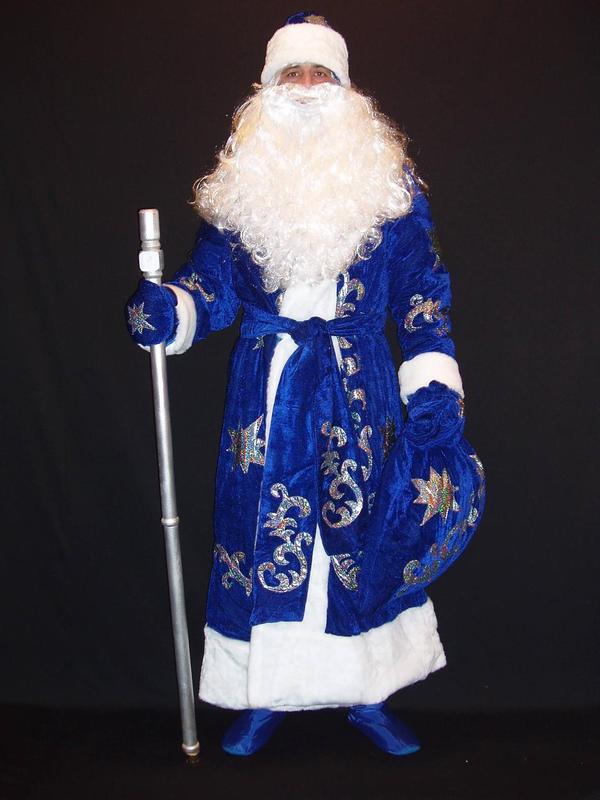 ## Костюм Св.Миколая/Д.Мороза ВЕЛИЧНИЙ СИНІЙ-5 р-р 56-60 Код 08530/ 107915 В наявності розміри костюмів: 1. 50-54 (довжина: 140 см, ширина: 71см) 2. 56-60 (довжина: 145 см, ширина: 81 см) У комплект костюма входить: 1. Шуба Діда Мороза із Синього щільного оксамиту, облямована білим хутром, на підкладці, аплікаціями на полицях шуби, рукавах та спині. 2. Шапка на підкладці, із Синього щільного оксамиту, облямована хутром, з двосторонніми аплікаціями 3. Пояс із Синього щільного оксамиту з аплікаціями. 4. Рукавиці на підкладці, із Синього щільного оксамиту, облямовані хутром, з аплікаціями 5. Реалістична середньодовга Борода «ВЛАДНА». Код 02719. Довжина - 40-45 см. вага - 65-75 грам 6. Чудова довга перука «Білий сніг», що підходить бороді. Код 01704. Довжина 55-65 см, вага 145-150 г) У комплект костюма Діда Мороза «ВЕЛИЧНИЙ СИНІЙ-5» НЕ ВХОДЯТЬ (можна придбати на нашому сайті додатково): - Посох Діда Мороза (можна вибрати будь-який за розміром, довжиною, типом верхівки, кольором і матеріалом виготовлення, конструкції (збірний або цільний) і ціною посох Діда Мороза з урахуванням вашого смаку та потреб). - Чоботи або валянки Діда Мороза (можна купити додатково на нашому сайті) різні за технологією виготовлення, матеріалом, висотою халяви, ціною - чоботи або валянки Діда Мороза. - Штани Діда Мороза (можна купити додатково на нашому сайті). Є всі розміри штанів, на будь-який зріст. Кольори – червоний, синій, бордовий. - Мішок для подарунків (можна вибрати будь-який за розміром, тканиною, кольором і колірними відтінками, з декором і без, із зав'язками простими або зі шнуром і хутряними облямівками). - Мікрофон портативний з підсилювачем та динаміком та модератором-змінником голосу.
