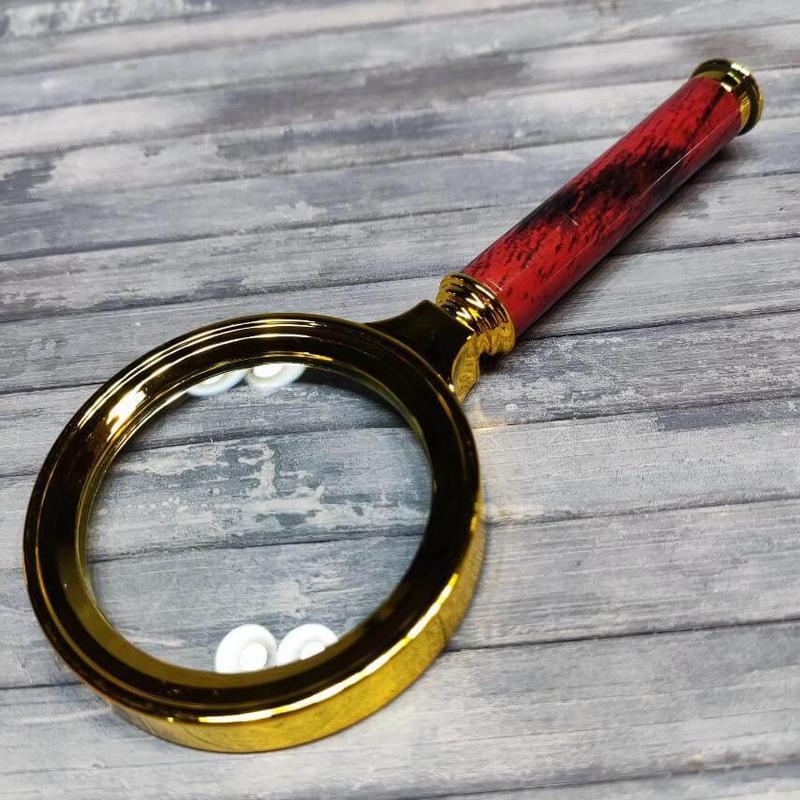 ## Лупа Шерлока Холмса ретро кратність Х6, справжня, вінтаж 60 мм Код 08814 Лупа Шерлока Холмса криміналістична вінтажна переглядова в імітації металевого корпусу - це не тільки чудовий аксесуар, виконаний у старовинному ретро-стилі, але й справжній інструмент перегляду з можливістю 6-кратного збільшення. Це означає, що цей товар можна використовувати як карнавальний атрибут, без якого не міг би успішно працювати відомий і легендарний англійський детектив з Бейкер-Стріт, і одночасно - як класичну, справжню лупу для читання або детального розгляду предметів з метою збільшення можливостей нашого зору. Лупа виготовлена в цікавому ретро-виконанні: корпус моделі має золотистий колір, а ручка виконана із пластику, що імітує натуральне дороге червоне дерево з оригінальним декором. Діаметр збільшувального скла – 50 мм, корпуси – 60 см Ручка згвинчується для компактного зберігання – видно на фото Скляна лінза здатна передавати чіткі кольорокоректні зображення з мінімальними похибками. Корпус лінзи виготовлений із пластику під латунний метал для більш надійного захисту лінзи від механічних впливів. Збільшення кратність: 6 Матеріал лінзи: Скло Діаметр об'єктиву, мм: 60 Матеріал корпусу: Пластик