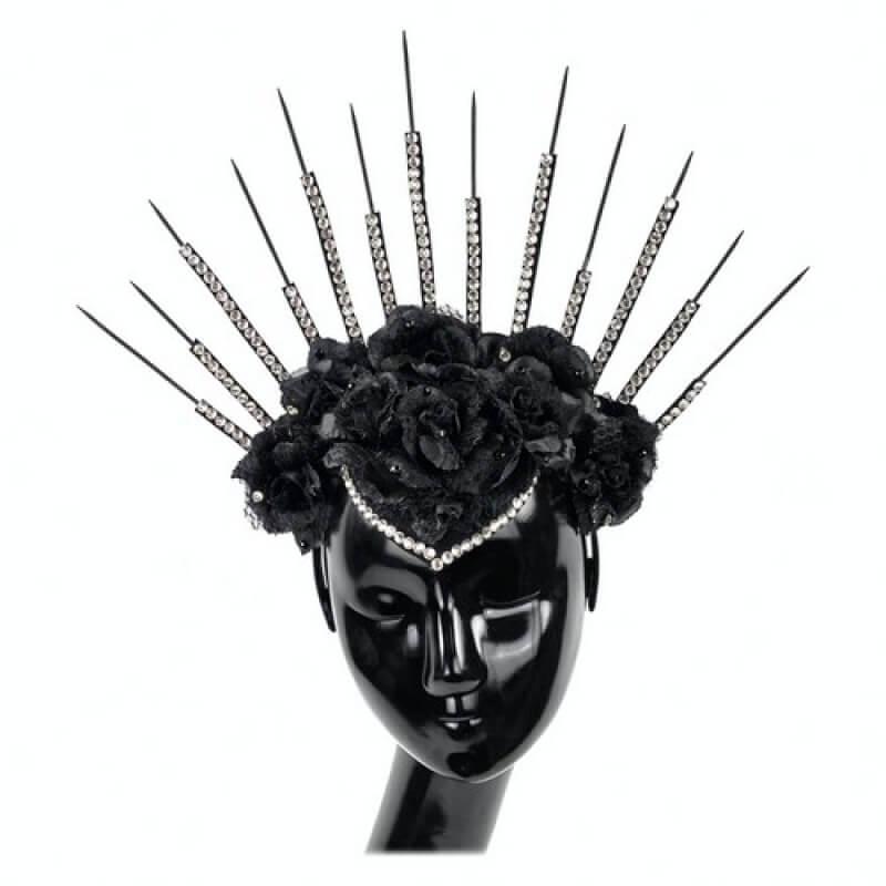 Обруч Diva Diamond 19-953BLK Матеріал: синтетична тканина, пластик Колір: сріблястий, чорний Висота композиції – 20 см. Оригінальний дизайнерський обруч, декорований променями, стразами та чорними трояндами, підійде для карнавального образу на тематичні вечірки: Санта Муерте (Santa Muerte), Хелловін (Halloween), космічна, зіркова. Додатково фіксується за допомогою гумки.