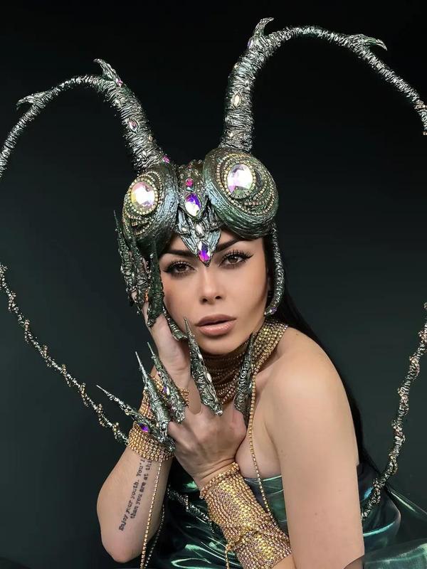 Епатажний головний убір унісекс, декорований камінням та стразовою стрічкою хамелеон, що створює образ бджоли, мухи, жука, комара або іншої комахи. Час виготовлення 2-3 робочі дні. Підходить для тематичної вечірки, косплею, літнього фестивалю, Burning Man, Хеллоуїна. Розмір - 56-60 см