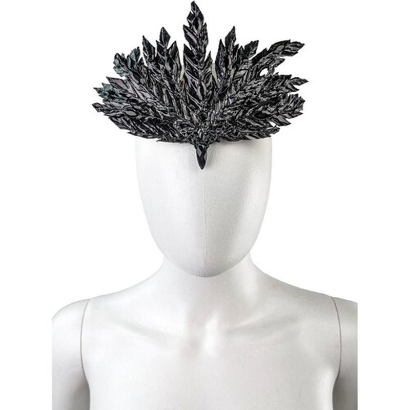 Ефектний головний убір, декорований чорним пір'ям у камінні, вензелем і стразом - відмінний вибір для готичної вечірки, фотосесії, для доповнення карнавальних образів: птах фенікс, лебідь, жар-птиця, сорока, ворона. Розмір універсальний, фіксується за допомогою двох металевих шпильок. Висота композиції - 11 см