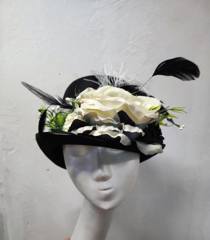 Карнавальный цилиндр с композицией из цветов и перьев - головной убор для вечеринки в таинственном саду (Secret Garden Party). Размер - 57-58.