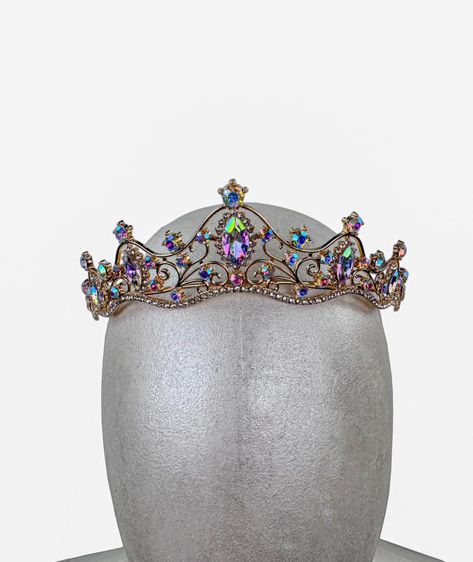 Висота - 4,3 см. Розкішна золотиста діадема з витонченим мереживним дизайном та камінчиками хамелеон. Ідеально підходить для святкових образів, фотсесій, випускних і весіль.