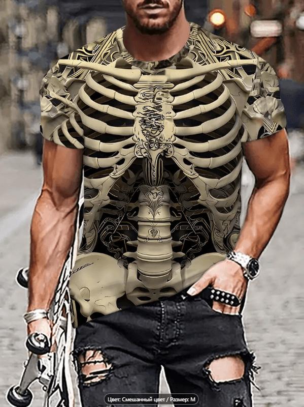 ## Костюм-футболка СКЕЛЕТ, р-р М, 3D-принт, Унісекс, Хелловін 081124 Спочатку перевірте свої справжні розміри. Наш товар має етикетку розміру М., але при цьому правдиві наступні параметри (порівняйте зі своїми обмірами): Об'єм грудей – 96-100 см Об'єм талії – 82-86 см Рекомендований зріст 175-180 см Примітка: якщо ваш розмір менший за вказані – не біда, адже головне, щоб футболка-костюм не була мала і коротка! Про товар: Придбання повноцінного дорослого карнавального на свято Хеллоуїна у гідній комплектації, як відомо, справа досить клопітна, а головне - дорога. Вихід є! Футболка з багатим об'ємним кольоровим принтом технології 3D, як ви добре бачите, може бути не тільки непоганим компромісним, а й цілком виграшним плюсовим рішенням! Ну, хіба що треба буде додати власні маску скелета або «Крік», рукавички з пазурами, бороду з вусами… А, може, нічого і не треба більше – все залежить від ваших цілей, завдань, місця і часу планованого свята Хеллоуїна! Товар підходить як жінкам, так і чоловікам Час не чекає і до 31 жовтня ви маєте бути готові на всі 100%