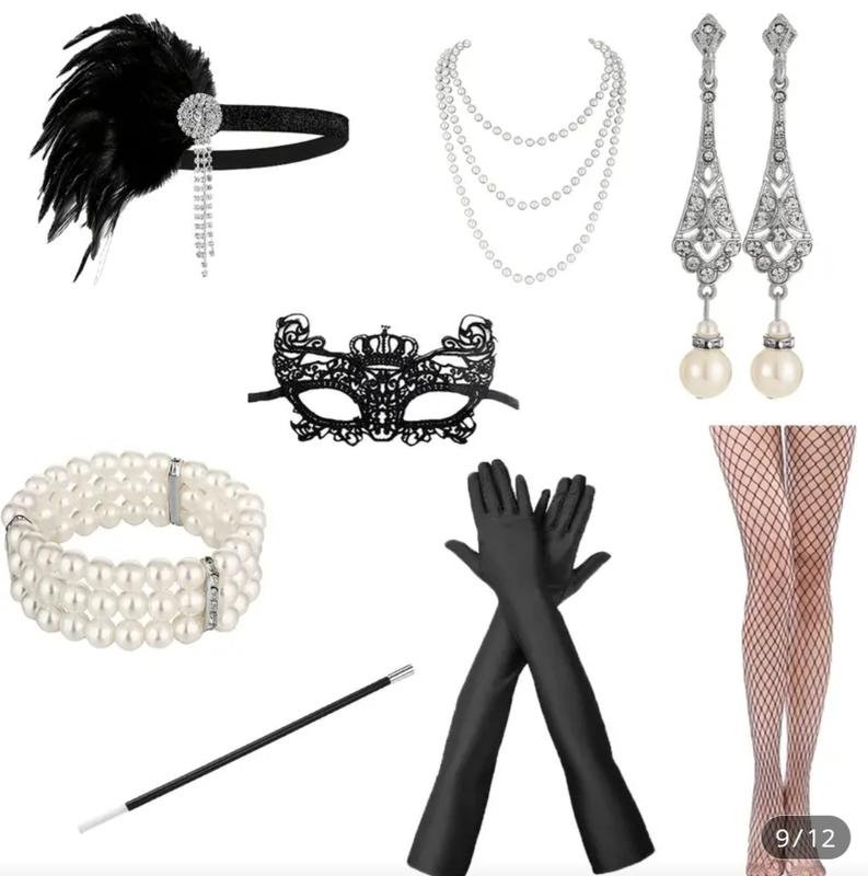 Ефектний набір аксесуарів в стилі Гетсбі з 8-ми предметів для створення яскравого образу. Ідеальний для тематичних вечірок, корпоративів та фотосесій. Входить: ✅️ пов'язка з пір'ям ✅️ рукавички довгі ✅️ намисто (імітація перлів) ✅️ сережки ✅️ браслет (імітація перлів) ✅️ колготки сітка ✅️ мундштук ✅️ маска