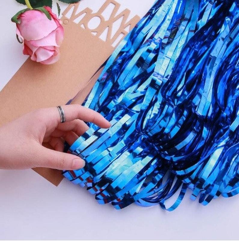 Шторки з фольги сині. Розмір: довжина 2м, ширина 1м. Колір: синій. Виробник: Китай. Всі наші товари Ви можете подивитися на нашому сайті: ******************** Дощик для фото зони синій довжиною 2м і шириною 1м Товщина як порізаний лист. Залишок недорезанного листа приблизно 10см. На фото це 1шт.