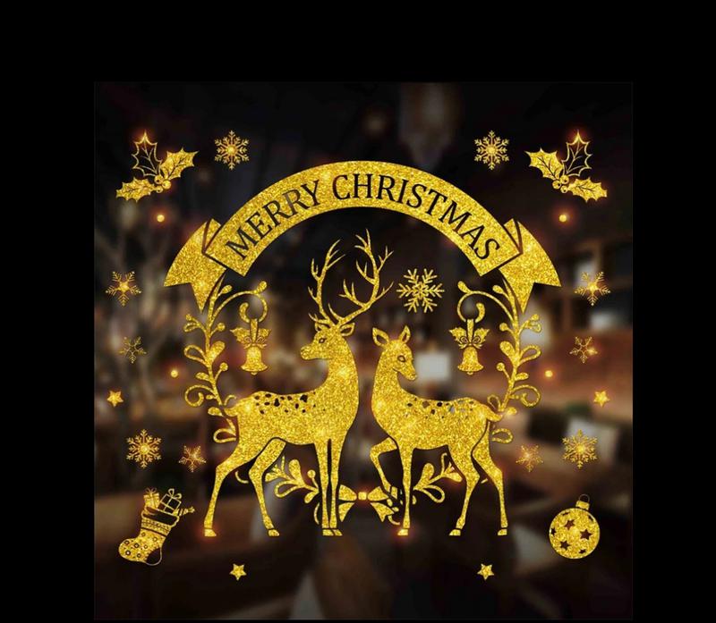 Новогодняя наклейка "Олени". Цвет: золото. Материал: высококачественный ПВХ. Размер: 60*49см. Нетоксичная, водонепроницаемая, силиконовая наклейка на окна. Можно применять на любую гладкую поверхность.