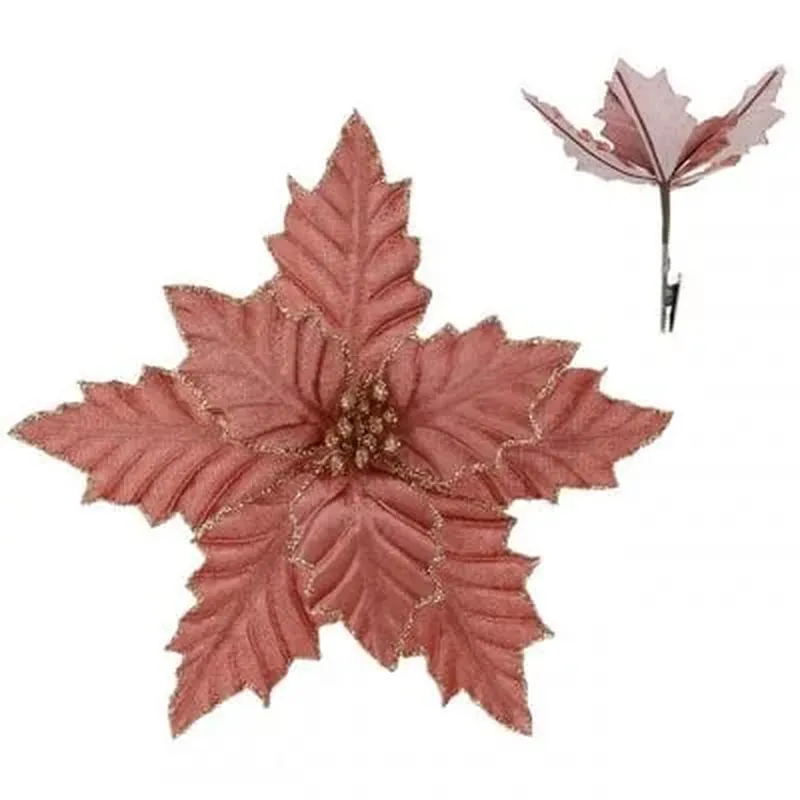 Квітка новорічна Пуансетія на прищепці оксамитова персикова. По краю покрита золотистими блискітками. Розмір : -Висота 13см. -Діаметр -18см. Використовується для новорічного дизайну , декорів , композицій , прикрашання ялинки.