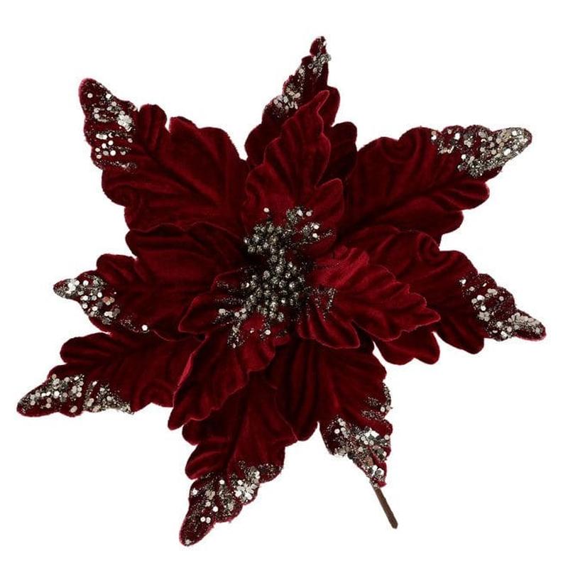 Квітка новорічна оксамитова Пуансетія бордова Штучна новорічна квітка пуансетія для декору і флористики бордового кольору. Висота (см) 24 Діаметр (см) 32