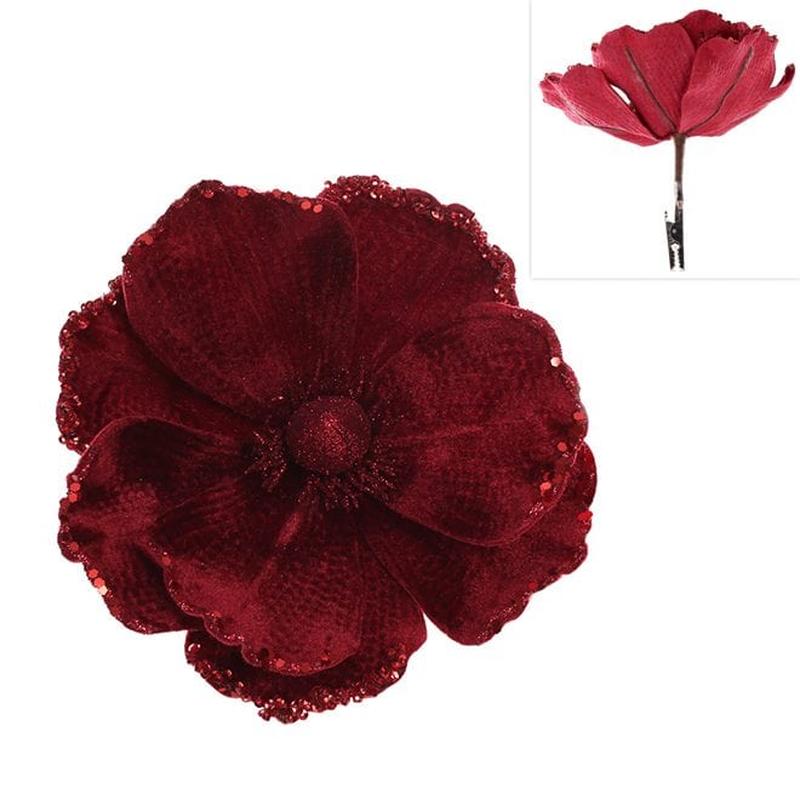 Цветок новогодняя бархатная магнолия на прищепке бордовый