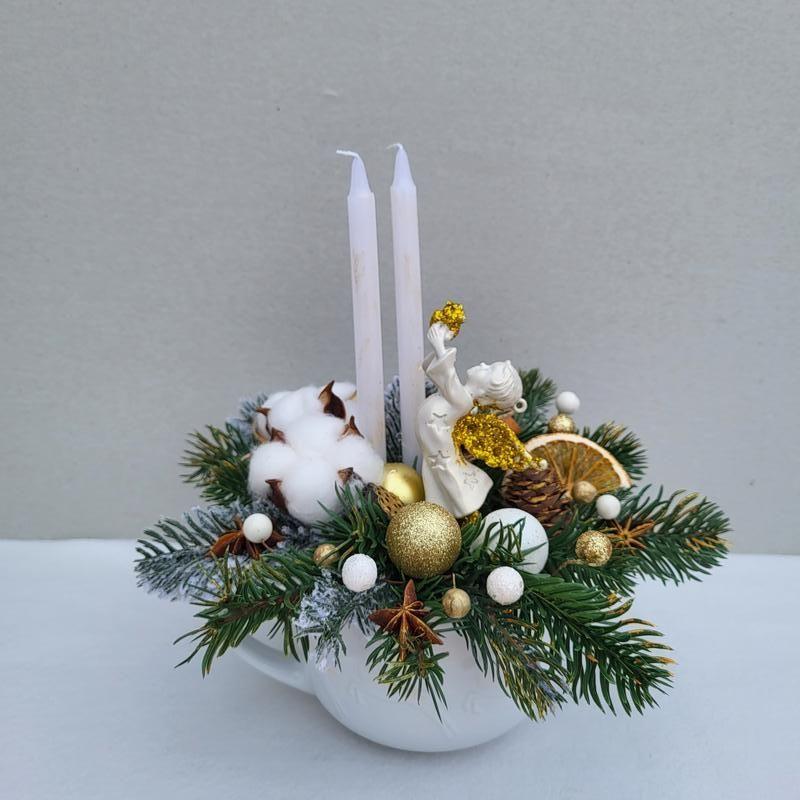 Різдвяна композиція з двома свічками та ангелом З матеріалів маємо штучну ялинку, бавовну, зірки бадяну, кориця, кульки та ягоди Композиція зроблена в білій тематичній до новорічних свят кружці з оленями. Діаметр кружки 11.5 см Якщо заміряти по гілках хвої, то діаметр композиції буде 22-23 см Така композиція, різдвяний підсвічник буде і чудовим подарунком на новий рік та Різдво