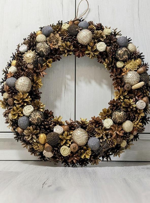 Різдвяний вінок діаметром 48 см. Зістарене золото, бронза, природні кольори + блиск - робить його особливо вишуканим. Мабуть, одна з моїх самих улюблених робіт. Використані шишки (соснові, модрини, туї) жолуді, горіхи, каштани, арахіс, персикові кісточки+ декор з тканини і ...частинка душі. БЕЗ ПЛАСТИКУ, 100% ручна робота. Кожна кулька і квіточка зроблена моїми руками. Товар виготовляється на замовлення