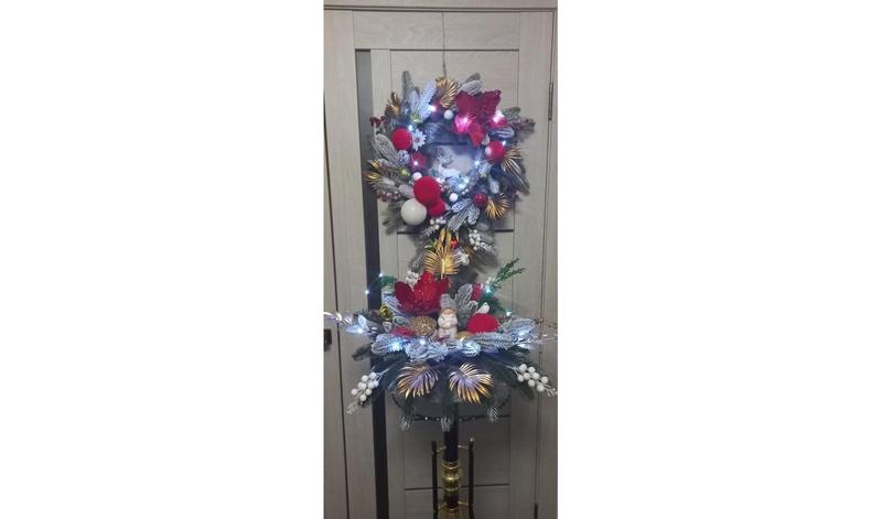 Новогодний рождественский набор состоит из венки и композиция. Новогодняя композиция высота 30 см, ширина 50 см. В работе использованы кашпо из натуральной лозы декоративная искусственная хвоя и разнообразный декор. Гирлянда LED на батарейках. Цена композиции 1400 грн. Новогодний венок диаметром 50 см., длина 70 см. Венчик сделан из искусственной хвои и разнообразного декора LED свет на батарейках. Цена венчика. 1600 грн.