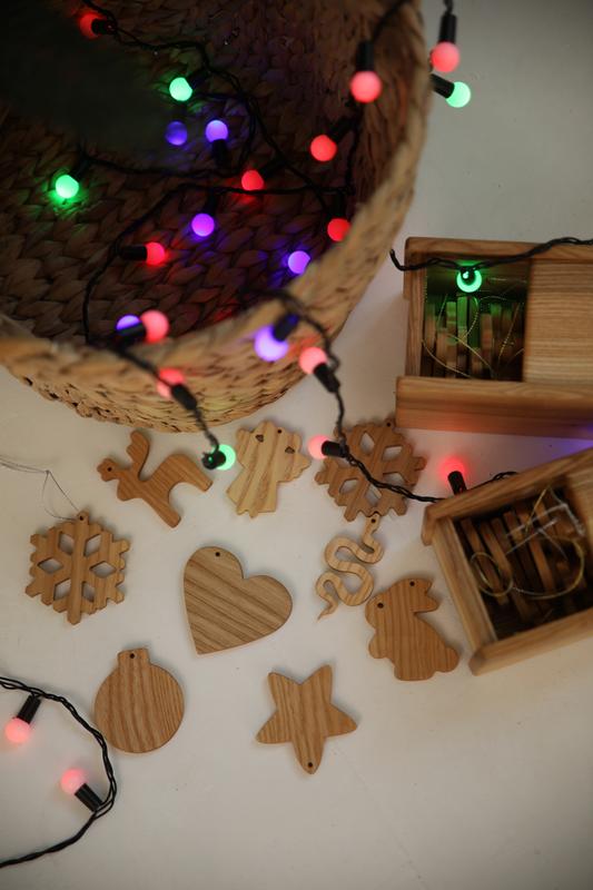Комплект з 12 новорічних іграшок з дерева ясеня, оригінальний декор на новорічну ялинку