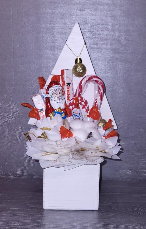 Склад композиції: *кашпо ялина (матеріал дерево) в подальшому можна використовувати для канцеляріїї чи інших дрібничок; *цукерка фігурка Миколая рошен 1шт * цукерки кіндер батончик 3шт * цукерки кіндер шоко бомс 11шт * цукерка посох 1шт * посох декор новорічний 1шт * шар новорічний 3шт різного розміру; *бавовна 1шт. Пакування композиціїї прозорий пакет зі стрічкою. За бажанням можу додати гірлянду 1м з батарейками +100грн. Габаритні розміри композиції : Висота 30см Ширина по нижній частині 9см Ширина ялинці 16см. Похибка замірів +/-5мм Вартість вказана на момент публікаціїї
