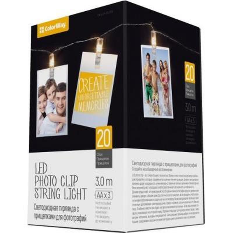 Украшение декоративное 20 LED, 3м, гирлянда с прищепками ColorWay (CW- LCP-20L30B) Светодиодная гирлянда с прищепками для фотографий СolorWay позволяет создать незабываемые воспоминания. 3.0 м предназначены для вашего творчества. Форма клипов полностью дублирует небольшие прищепки, которые соединены прозрачным тонким проводом. Дизайн светодиодных зажимов дарит воздушность и минимализм с приятным теплым свечением. Миниатюрный блок питания (для 2-х батареек типа АА) обеспечивает автономность и мобильность. Данная прядь огней — это уникальный способ презентовать фотографии, рисунки, записки или элементы декора в вашем доме. Достаточно просто закрепить их на прищепки, чтобы осветить яркие воспоминания и создать уютную атмосферу. Также светодиодная гирлянда станет отличным дополнением к интерьеру дома: гостиной, спальни, крыльца или вашего сада.