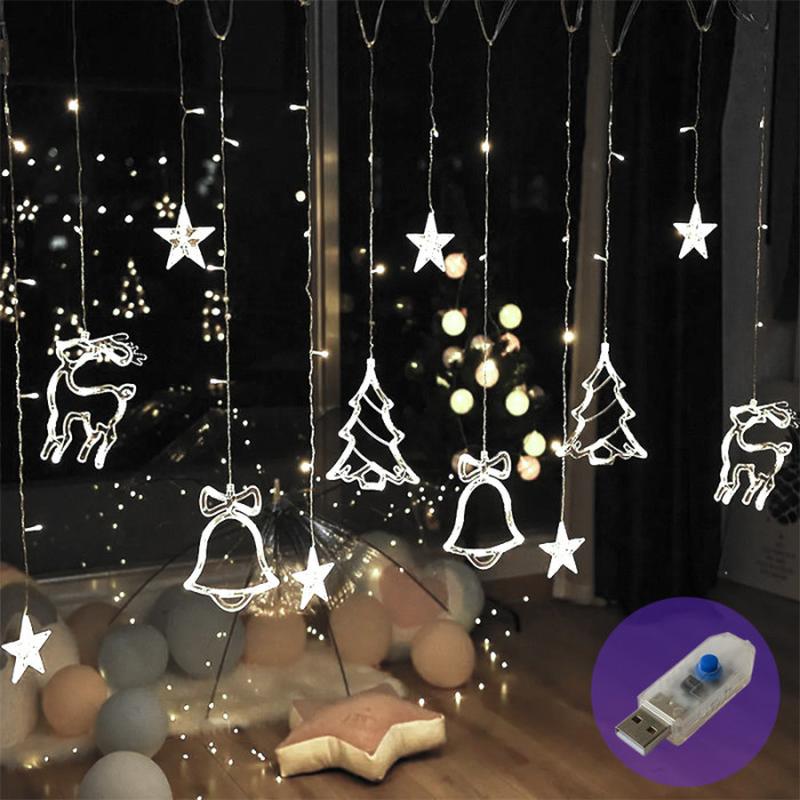 Гірлянда штора xr-9w зірки, ялинки, олені, дзвіночки (12 фігурок) 3 х 1м, usb та батарейка...
