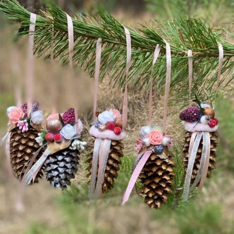 Набір новорічних хенд-мейд прикрас на вашу ялинку (шишки натуральні) . Також стане гарним подарунком близьким людям. Шишка (12см) - 5шт, 325грн Кулька (7см) - 5шт, 585грн В подарунок 4 шишки на ялинку (останнє фото)