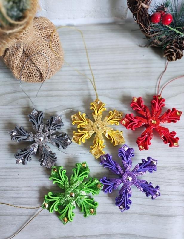 Набор состоит из 5 декоративных звездочек-снежинок из фоамирана, диаметром около 8 см. ✨ Особенности набора: Выполнены из блестящего фоамирана, красиво мерцающего при освещении. Каждая звездочка имеет объемный ажурный дизайн и украшена серединкой со стразом или декоративным элементом. В наборе - 5 разноцветных снежинок: серая, золотая, красная, фиолетовая и зеленая. Каждая звездочка оснащена петелькой для подвешивания, подходит для елки, декора праздничного интерьера, упаковки подарков или фотозона. Легкие, прочные, не ломаются, сохраняют форму. 🎄 Идеально подходят для: новогоднее оформление дома, офиса, школы handmade декору создание праздничной атмосферы Красивый, яркий и праздничный акцент для зимнего декора!