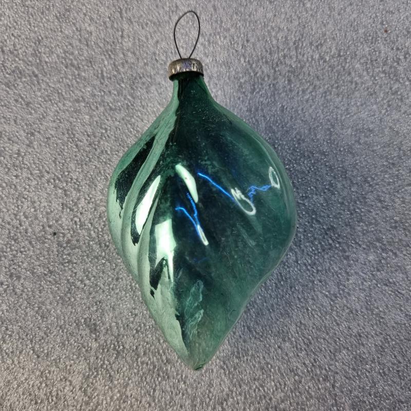 📋 Описание: Стеклянное елочное украшение в форме листа с рельефными прожилками. Изготовлена из тонкого зеленого стекла с металлическим блеском. Имеет металлическую крышечку с петелькой для подвешивания. Визуально привлекательна благодаря игре света на поверхности. Ориентировочно 1960–1970-е годы, СССР. ⚠️ Дефекти: Небольшие потертости на стекле, характерные для возраста Металлическая крышечка имеет следы окисления и износа Возможны микротрещины у горлышка