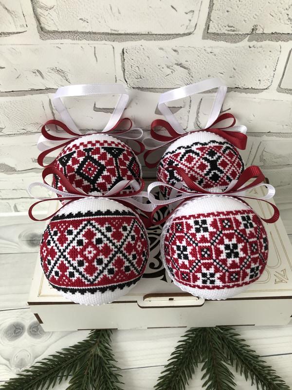 Новорічні кулі ручної роботи. У набір входить 4 іграшки висотою 7 см. Боки кульки оздоблені білою тасьмою. Кульки продаються в подарунковій коробці. Гарний подарунок близькій людині.