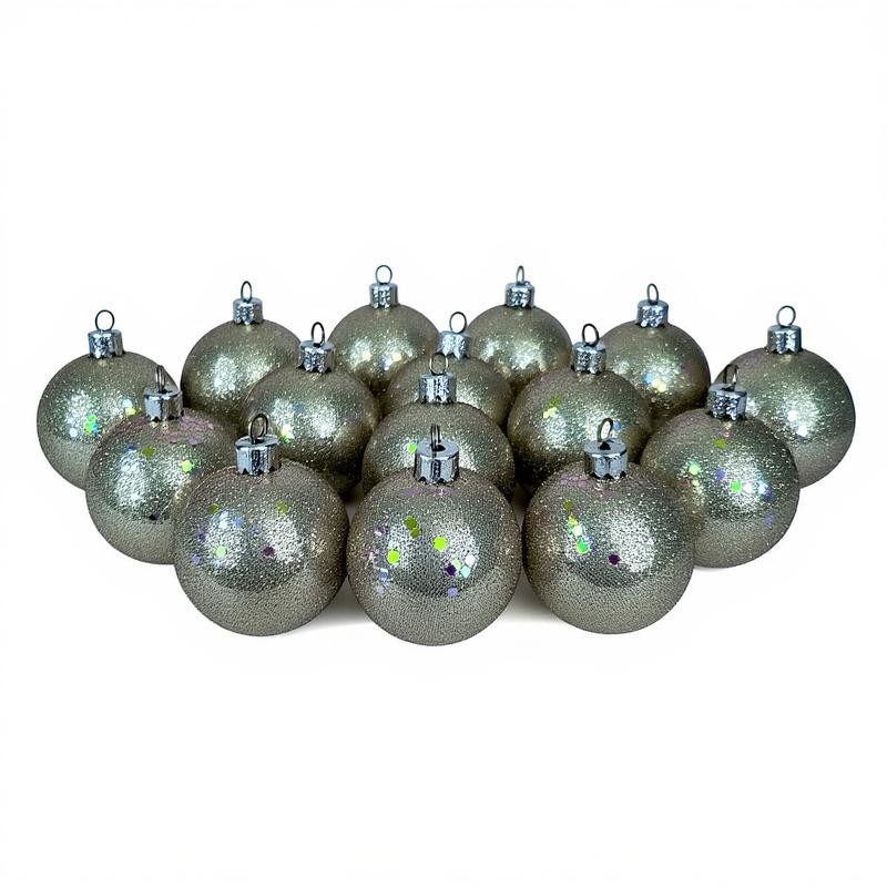 Набір із 15 новорічних куль діаметром 6 см у тоні «шампань» -- це універсальний комплект для теплого та затишного святкового оформлення. М'який відтінок шампань із мерехтливим глітером і дрібними декоративними частинками створює делікатне сяйво, яке змінюється за різного освітлення. Такий колір легко поєднується з білими, золотими та пастельними прикрасами, даючи змогу створити гармонійну й елегантну композицію на новорічній ялинці або в інтер'єрних інсталяціях. Кулі виготовлені з легкого та міцного пластику, завдяки чому вони стійкі до ударів і не пошкоджуються в разі випадкових падінь. У верхній частині кожного виробу передбачено кріплення, що дає змогу легко закріпити прикрасу на ялинці або ввімкнути її в інші елементи святкового декору. Основні характеристики набору новорічних куль на ялинку: Матеріал: пластик; Діаметр: 6 см. Завдяки вдалому поєднанню кольору, розміру та декоративного покриття, набір підходить як для прикрашування невеликої ялинки, так і для створення об'ємних святкових композицій. Ці кулі допоможуть зробити декор більш насиченим і гармонійним, додавши новорічному оздобленню яскравості та глибини.