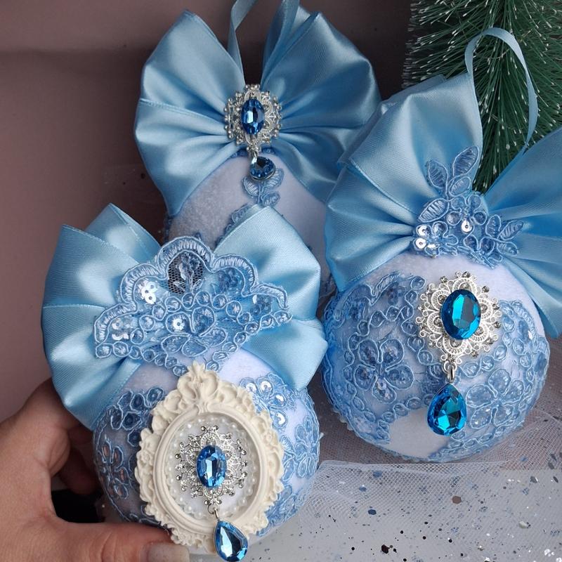 Набір ялинкових куль в ніжно блакитному кольорі діаметр кулі 8 см повністю ручна робота