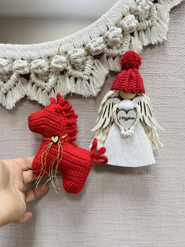Набір прикрас до року вогняного коня - янголятко в шапці і червоний коник буде чудовим подарунком ручної роботи до Різдва. Розмір янгола 15 см Коник 10 см Подарункове пакування 20 на 15 см