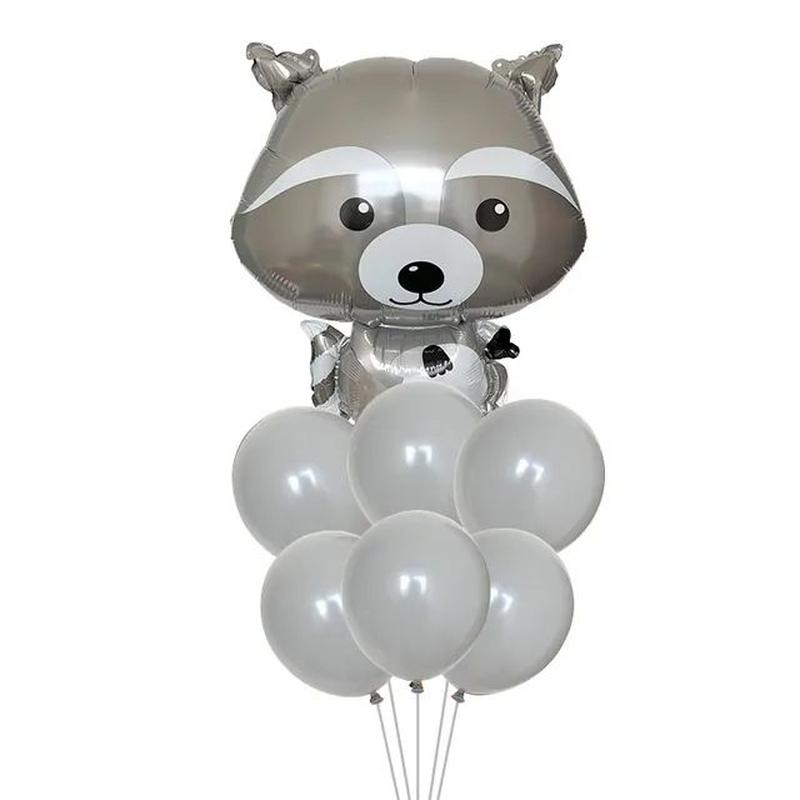 Набір повітряних кульок Єнот та кульки У набір входить: Фольгована фігура Єнот (відрізняється від зображеного на фото, див. фото 2) 73 см × 60 см - 1 шт Латексна повітряна куля сіра металік 25 см - 6 шт Клейові точки 20 шт За бажанням окремо можна придбати стійку для повітряних кульок на 7 куль висотою 70 см за 90 грн