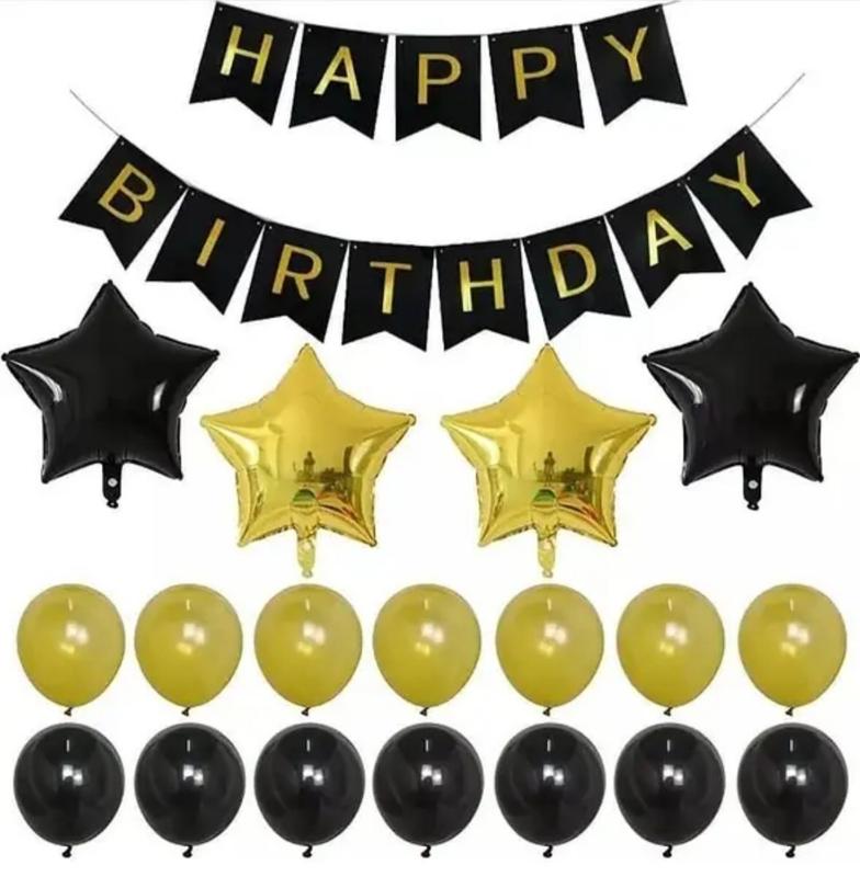 Набор воздушных шариков В набор входят: Бумажная надпись Happy birthday черный - 1 шт Фольгированная фигура Звезда золото 45 см × 45 см - 2 шт Фольгированная фигура Звезда черная 45 см × 45 см - 2 шт Латексное воздушное золото хром 30 см - 7 шт Латексный воздушный шар черный 25 см - 7 шт Клеевые точки 20 шт Лента 10 м