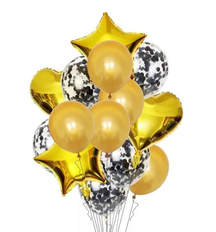 Набір повітряних кульок У набір входить: Фольгована фігура Зірка золото 45 см × 45 см - 2 шт Фольгована фігура Серце золото 45 см × 45 см - 2 шт Латексна повітряна куля золото металік 25 см - 5 шт Латексна повітряна куля з конфетті чорне 30 см - 5 шт Клейові точки 20 шт Стрічка 10 м