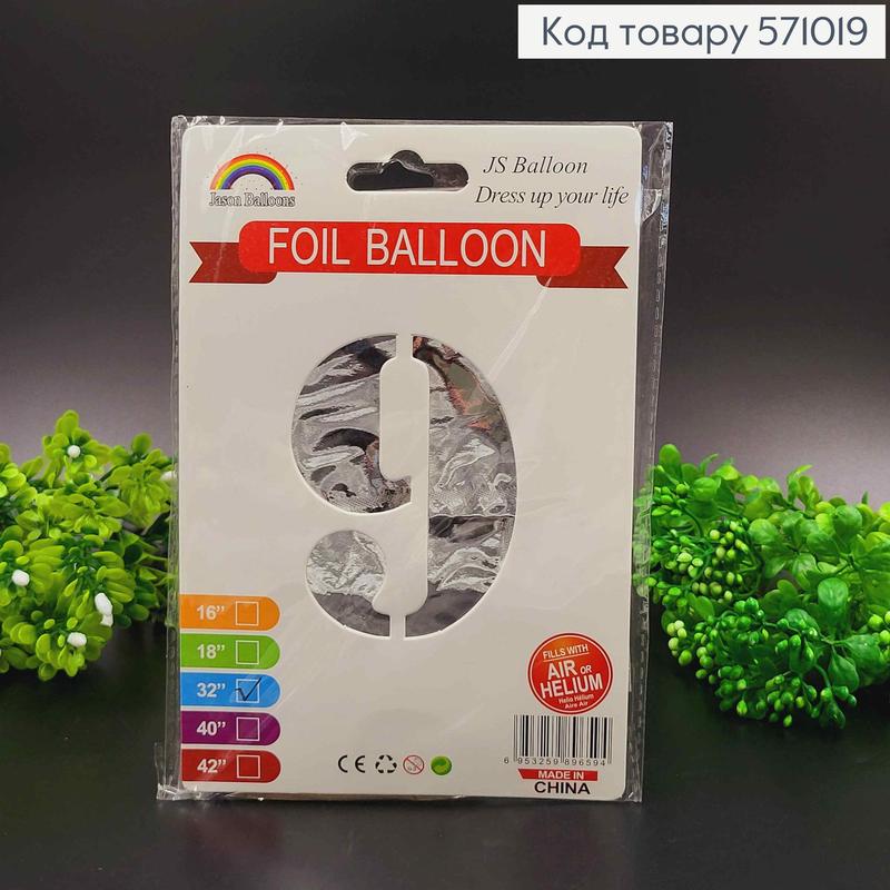 Надувна фольгована цифра "9" сріблястого кольору 32" 76см на свято, надувний фольгований ф...