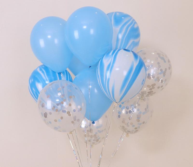 Набір повітряних кульок У набір входить: Куля блакитна агат 25 см - 3 шт Куля блакитна 25 см - 4 шт Куля зі срібним конфетті 30 см - 5 шт