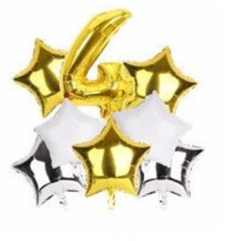 ## Воздушные фольгированные шарики В набор входит: - Цифра 4 золото 70 см - 1 шт - Звезды 45 см: золото - 3 шт, серебро - 2 шт, белые - 2 шт Прекрасно подойдут на первый день рождения Яркие, прочные и не дорогие! В домашних условиях можно надуть с помощью насоса или трубочки для напитков Цвета можно комбинировать в любом количестве! .