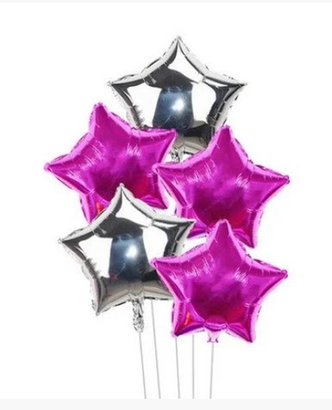 Набір фольгованих кульок на Новий рік. Комплектація: - Зірки 45 см 5 шт (2 шт. срібло, 3 шт. фуксія) Будь-який колір куль можна замінити на інший, наявний! Побажання вказуйте в коментарі до замовлення!